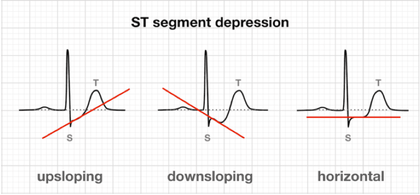 EKG- Ključna promjena kod AKS jesu promjene ST segmenta koje ukazuju na postojanje ishemije. Pored ovih promjena također je jako važno pratiti i druge elemente na EKG snimku. Takve promjene jesu tzv. hiperakutni T valovi u susjednim odvodima, te inverziju T valova. Također svaka klinička slika AKS, uz postojanje novonastalog bloka lijeve grane smatra se infarktom.