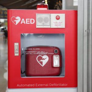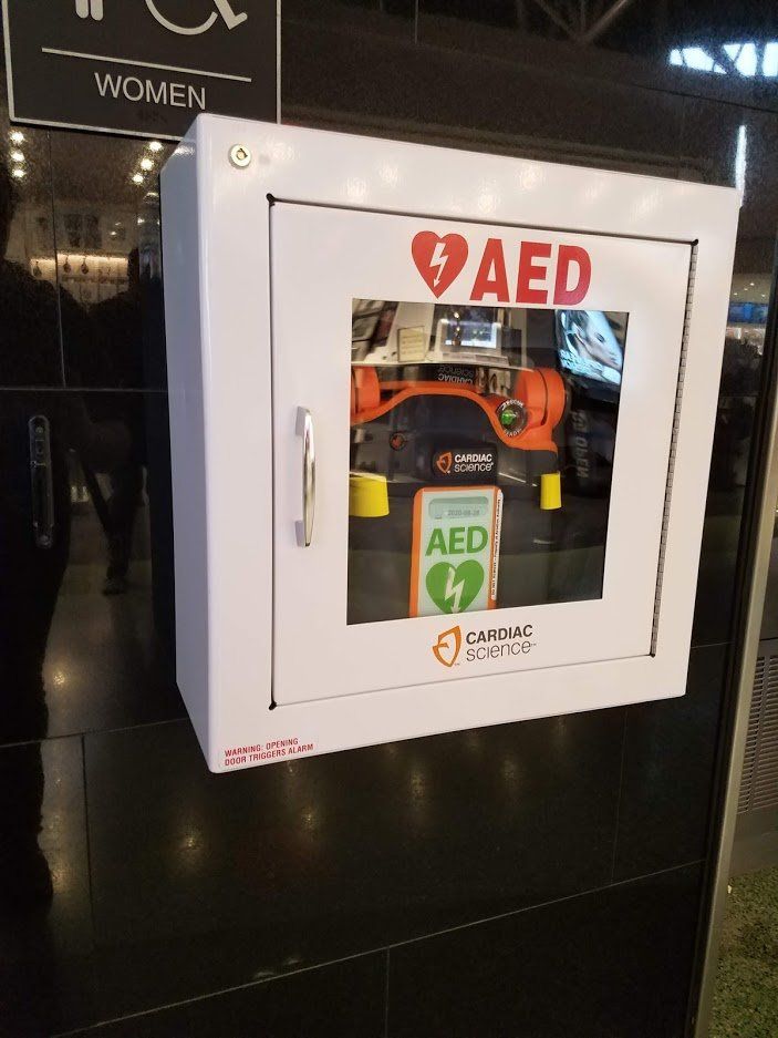 AED treba postaviti na javnim mjestima kao što su: sportski tereni, trgovački centri, aerodromi, kongresni centri, hoteli, škole i ordinacije.