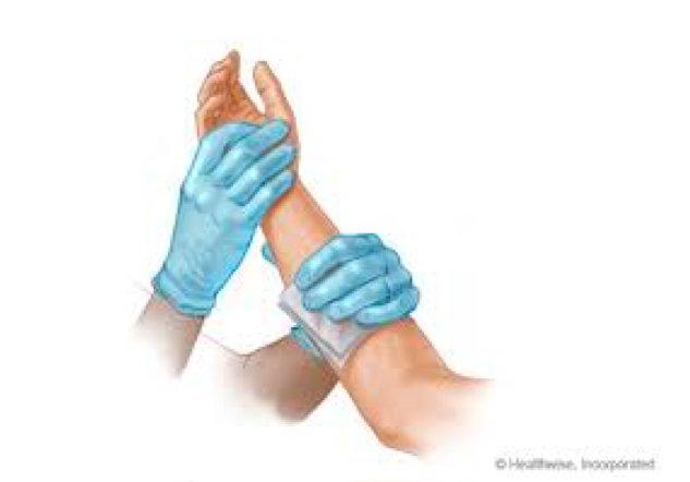 3.    Primijeniti neki drugi postupak privremene hemostaze: pritiskanje prstima (digitalna kompresija), konstrikcione poveske (Esmarhova poveska i modifikacije, Turnikeova poveska), hvatanje suda hvatalicom (klemom ili posebnom stezaljkom, klipsom), tamponada (pakovanje) i lijepljenje rane.