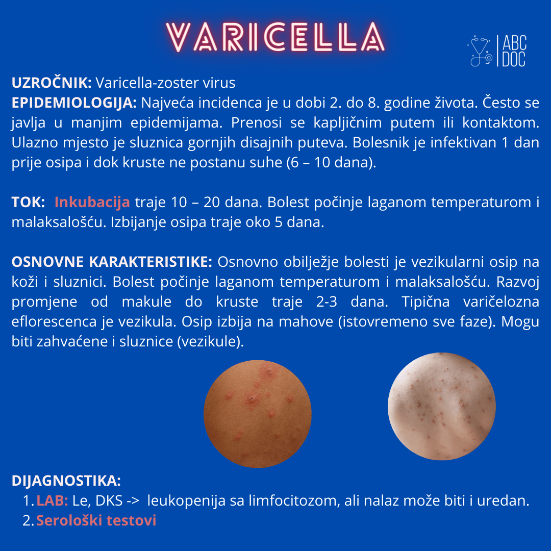 Osnovno obilježje bolesti je vezikulozni osip na koži i sluznici. Inkubacija traje 7 – 23 dana, najčešće 14-15 dana. Bolest počinje laganom temperaturom i malaksalošću. Osip se javlja prvo na trupu, potom na vratu, glavi, ekstremitetima. Gušći je na trupu i glavi nego na ekstremitetima (centripetalna distribucija). Razvoj promjene od makule do kruste traje 2-3 dana. Tipična varičelozna eflorescenca je vezikula. Osip izbija na mahove (istovremeno sve faze: makule, papule, vezikule i kraste). Pojavljuje se i na sluznicama usta i ždrijela, kadkad i u larinksu. Enantem je osobito dobro vidljiv na nepcu. Izbijanje osipa traje oko 5 dana.